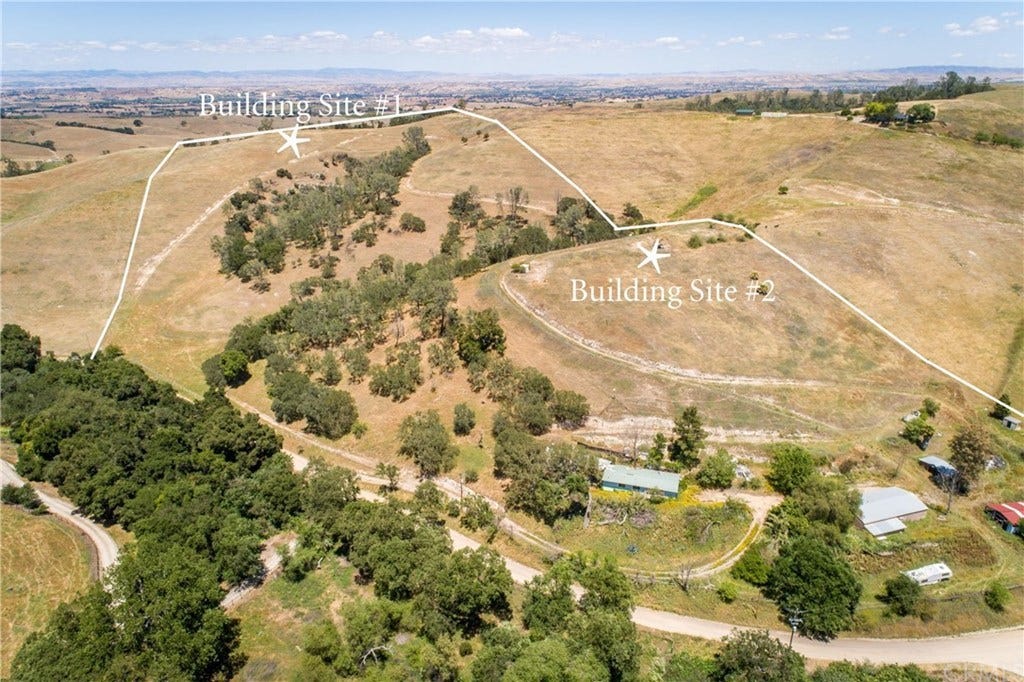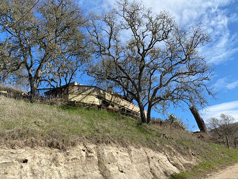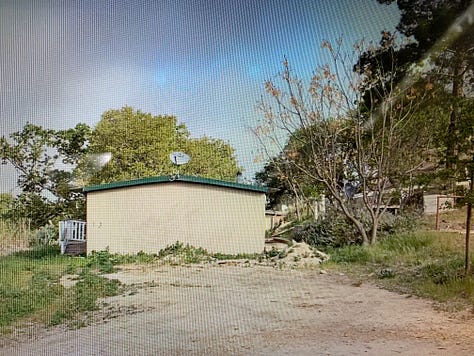 The lay of the land was varied - two wooded arroyos that opened into a wide open pasture; a level, barren mesa at the top of the dirt driveway (Building Site #1); and a flat-ish area home to a grouping of decaying manufactured homes, a ramshackle barn, chicken coop, covered storage space, van chassis, and weird grow-room thing. Seemingly, every structure was decaying, being absorbed by its surrounding flora.